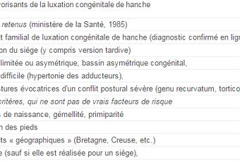 On désigne sous ce vocable un ensemble de facteurs qui (au travers d’un mécanisme génétique ou mécanique « postural ») prédispose à la constitution d’une luxation de hanche. Ils sont rattachés aux antécédents, aux circonstances obstétricales (siège) ou à l’enfant lui-même (signes d’examen). Leur présence incite à pratiquer un examen clinique encore plus attentif et, s’il est normal, à proposer par sécurité une imagerie complémentaire (échographie ou radiographie). Le « poids » de chacun de ces facteurs est discuté. On peut proposer la hiérarchie présentée dans le Tableau 1.