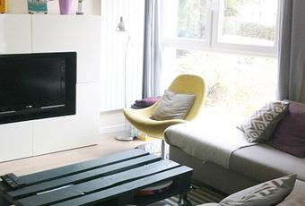 Le 2e meuble est ma célèbre table basse réalisée à partir d’une palette. Je l’ai repeinte dans un ton gris plus foncé et l’ai associée à un tapis graphique dans les mêmes tons (acheté chez Castorama).