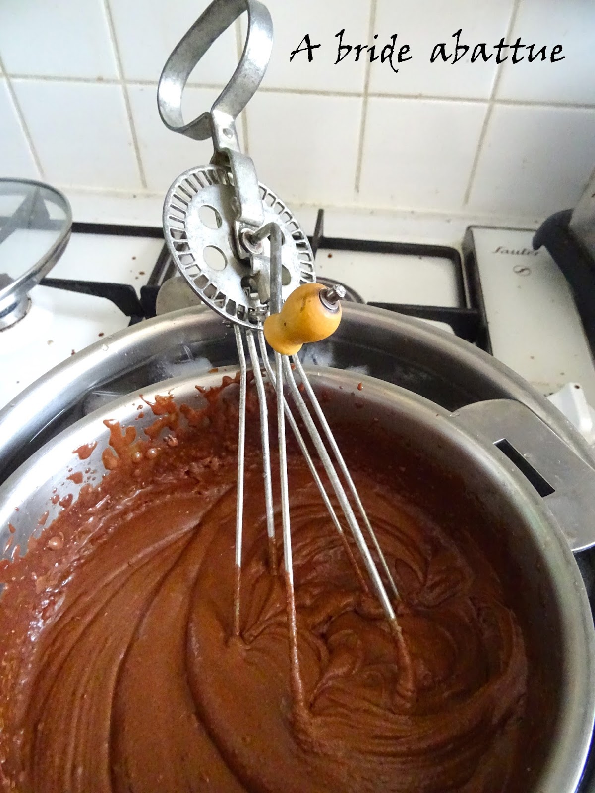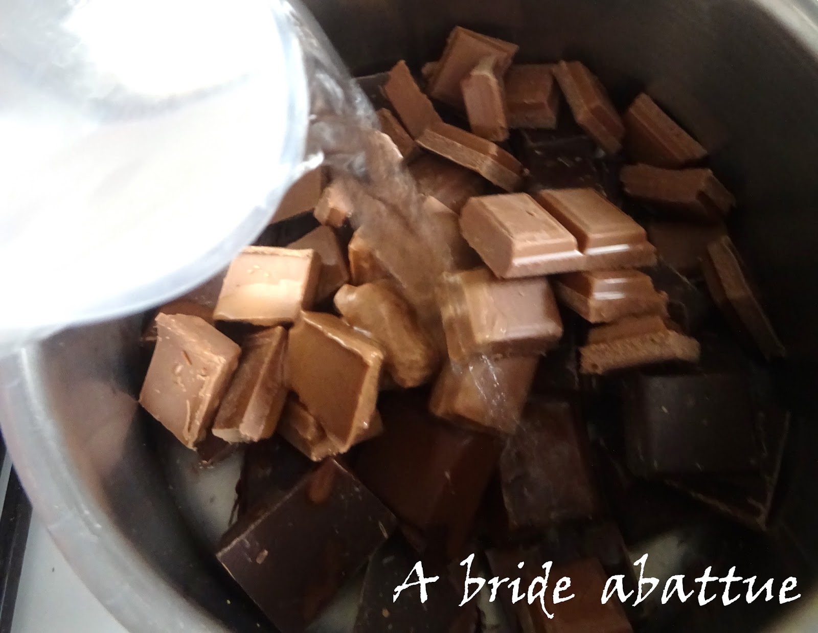 Pour une tablette de 250 grammes de chocolat noir on prendra 20 cl d'eau filtrée, ou d'un autre liquide de type thé ou infusion, ou même du jus d'orange, ce qui donnera un goût particulier au dessert. J'ai employé 200 grammes de chocolat d'une marque distributeur ainsi que 170 grammes de Nestlé Dessert praliné parce que je voulais un résultat doux et gourmand (j'ai donc ajouté 30 cl d'eau filtrée).