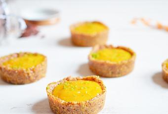 Voici des petites tartelettes au coeur coulant de mangue. Des ingrédients sains et naturels avec de nombreux superaliments au programme : graines de chia, lucuma de soie crue et baies de goji. Une recette sans sucres ajoutés, puisque les seuls présents sont ceux des fruits secs et de la mangue. Pour ma touche personnelle, j’ajoute quelques zestes de combava à la mangue pour une saveur incomparable !