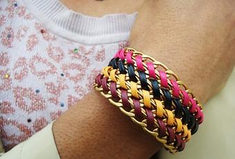 Issue de la ligne « Art déco », cette manchette torsadée qui mixte avec brio acier doré et cuir multicolore est résolument le détail couture de ma tenue.