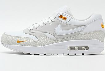 Cette Air Max 1 reprend la même construction que la 1ère “Atmos” Safari de 2002, avec donc une toebox en canvas et non du nubuck “chevelu”. On note toutefois que le medial panel gris et le talon blanc ne reprennent pas exactement les mêmes matériaux. Pour le reste, tout y est, l’énorme Swoosh au talon, le mini Swoosh sur le mudguard à l’imprimé Safari et la différence de couleur sur les logos intérieur/extérieur du pied. L’ensemble est un mélange de blanc et de gris clair accentués par quelques touches de Kumquat (fruit) qui donne son surnom à la silhouette.