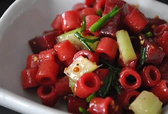 Salade1 bouteille de 500 ml (2 tasses) de jus de betterave (voir note)1 pot de 500 ml (18 oz) de betteraves marinées, égouttées et coupées en dés375 g (¾ lb) de macaronis courts2 branches de céleri, coupées en petits dés60 ml (¼ tasse) de ciboulette fraîche ciseléeSel et poivre