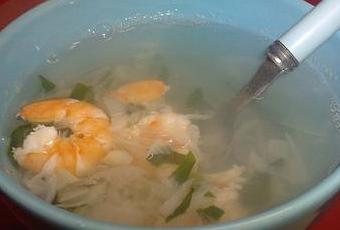 Je fais chauffer de l'eau dans une casserole avec l'oignon émincé, les crevettes décortiquées, les feuilles de basilic coupées au ciseau pendant 15 min.