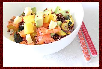 Préchauffez le four therm.7 (210°). Lavez et tranchez la courgette. Epluchez et découpez l’oignon en morceaux. Déposez sur une plaque recouverte de papier sulfurisé et arrosez d’un filet d’huile d’olive. Salez, poivrez et mettez au four pour 20 à 30 minutes. Sortez du four et laissez tiédir. Dans le même temps, faites cuire le quinoa rouge dans 3 volumes d’eau pendant 20 à 30 minutes. Laissez tiédir. Coupez l’emmental, la carotte et la demi-mangue en dés. Découpez le saumon fumé en fines lamelles. Découpez l’avocat en dés et arrosez de jus de citron. Préparez la vinaigrette en mélangeant le jus d’un demi-citron avec l’huile d’olive et l’huile de noix. Mélangez tous les ingrédients, ajoutez la vinaigrette et servez.