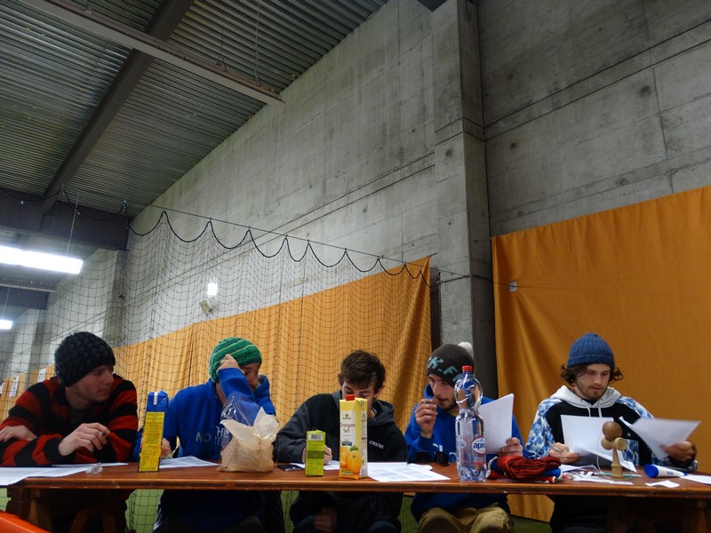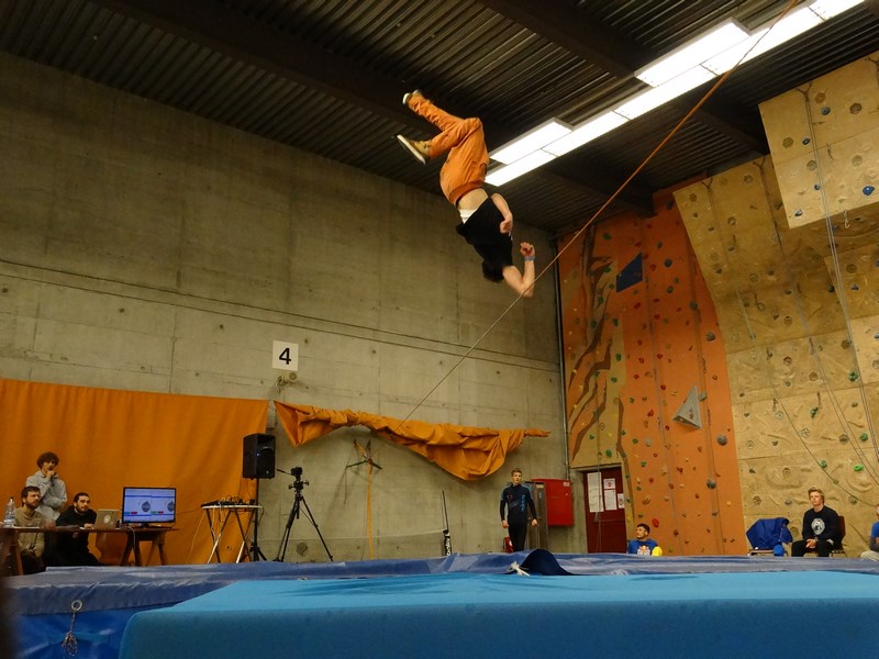 Après 4h de route, une pause pipi et l'achat de la vignette à 40€, nous arrivons sur la commune de Leysin. Etant en suisse, nos GPS sur les portables de fonctionnent plus, donc nous partons à la recherche de l'office du tourisme de Leysin pour demander ou sont les fous de la sangle molle sur-tendue ! L'office se trouve collé à un gymnase et une piscine. Pendant que les zigotos demandent, j'ai pu observer qu'une ligne était tendue au dessus d'un terrain de tennis. Soulagé et heureux de les avoir trouver en one-shot, nous allons leur rencontre. Dans le gymnase nous retrouvons Lyell, jeune jumper Suisse que nous avons rencontré en France sur le tour Rock The Line de slack.fr en 2015. Louis Boniface est présent ainsi qu'une partie du Larmichette Crew( groupe de slackliner local) et quelques jumpers étrangers. Nous discutons avec tout le monde, content de ce retrouver ou de se rencontrer. Deux trois jumpers dont Justin Wager et Lyell jouent au kendama (bilboquet remastérisé). Deux autres jumpers hollandais sont présents ainsi qu'un Autrichien. Ca se chauffe un peu sur la sangle à 1,65m de haut et 22m de long. Ça change un peu de mes débuts de jump avec 1,10 sur 16m. Il va falloir s'adapter...! 23h direction les dortoirs, et apéro oblige avec les autres jumpers. Et à 1h du matin, dodo pour la plupart car demain contest !!!! Pour ma part levé a 7h30 pour être le premier sous la douche. Direction une boulangerie pour un petit déjeuné. Louis et Nathan y sont déjà, je me mets a leur table et commande une formule petit déjeuné plus 1 double expresso pour réveiller mes neurones. 2 croissants, un bout de pain et confiture, un petit verre de jus d'orange et le café 15euros.., whaouuuu ont est en station suisse et ça ce sent ! 10h, début des training pendant que les jumpers arrivent. Ça ce chauffe et les têtes sont bien plus souvent en bas que en haut. Sur une petite ligne d’échauffement la jeune Ornella tombe du tapis et se déboîte la cheville. C'est pas jolie jolie mais elle garde le moral et part aux urgences sous les applaudissements des jumpers. (On espère la revoir vite sur un contest en France!) Explication des règles du jeux en anglais et comme bon frenchies qui ne parle que peu anglais nous demandons une traduction française! Nico fera partie du jury ( j'ai essayer de le soudoyer toute la nuit, mais rien n'y fait!) Pour les juges, Lyell jeune suisse qui envoie le pâté mais blessé. Nico Margaron de la team et Justin Wagers, (désolé, les deux derniers je les connais pas!)