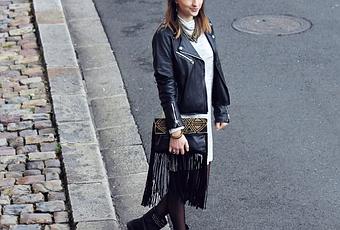 Pour l'occasion, je vous propose une tenue un peu plus rock que d'habitude composée de plusieurs nouvelles pièces, dont cette magnifique pochette pour laquelle j'ai eu un véritable coup de coeur. Avant, quand je voyais un vêtement ou un accessoire un peu plus tape à l'oeil que la normale, comme cette pochette avec ses loooongues franges, je n'osais pas passer le cap, car je ne voulais pas trop me faire remarquer, à cause de mon problème de cheveux peut-être, et parce que je pensais que ça ferait trop décalé de porter ce genre de pièce à la campagne. Mais de plus en plus, j'arrive à assumer mes goûts et à moins me soucier de ce que diront les gens! C'est une petite victoire sur moi-même! :D