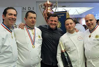 De g. à d. : Fabrice Prochasson (Académie culinaire de France), Christophe Marguin (président de l'édition), le chef Gérard Sallé, le vainqueur Romain Schaller et Stéphane Buron (président d'honneur) I photo ©SaintJean