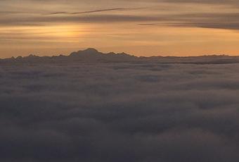Au-dessus des nuages j'oublie la course du monde, m'émerveille du blanc cotonneux et du ciel qui s'enflamme doucement, découpant les Alpes sur fond d'or. Je savoure ma chance d'être là, entre ce spectacle fabuleux du jour qui se lève et m'enchante et mes compagnes de voyage.