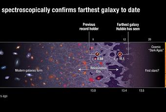 Tout au long de sa carrière, Hubble n'a eu de cesse de repousser les limites d'observation des profondeurs du cosmos afin de sonder l'enfance de l'Univers. Un nouveau un record de distance vient d'être battu : une vigoureuse petite galaxie située à 13,4 milliards d'années-lumière, soit 400 millions d'années seulement après le Big Bang. Désormais le télescope spatial empiète sur le territoire que seront à même d'explorer ses successeurs, JWST et WFIRST.