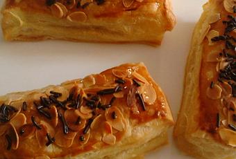 Dorer chaque feuilleté, parsemer d'amndes effilées et mettre à cuire dans un four préchauffé à 200°c jusqu'à ce que la pâte feuilletée soit bien dorée.