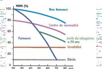 Ce graphique illustre parfaitement mes dires. Vous pouvez voir que le décès chez le fumeur lambda survient plus rapidement, de par cette diminution plus rapide de sa capacité pulmonaire.