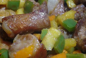 Moi j'ai choisi le wok et frits, des travers de porc coupés en cubes, une marinade au soja et surtout une sauce aigre douce avec des bons fruits et légumes.
