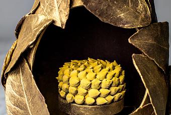 Sa coque chocolatée est habillée de feuilles de citronniers en chocolat noir de Madagascar 64% de cacao. Ce feuillage recouvert d'or, met à l'honneur la noblesse d'une création recherchée en parfaite symbiose avec le décor de cette MAISON DE LUXE.