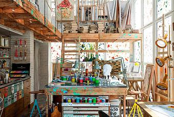 Je ne sais pas si ça vous fait le même effet, mais parfois je regarde autour de moi, comme si j'observais une scène de cinéma, et je trouve les choses un peu triste. Ce sentiment, je l'ai eu très fort pour la première fois, après mon retour d'un an passé en Inde. Et en ce moment ça me refait la même chose. Les gens ne sourient pas beaucoup, tout est gris, lisse, uniforme,un peu fade, rien de dépasse, tout le monde court, et moi là dedans, j'ai comme une envie folle de prendre une bombe remplie de couleur et de fun et de la lâcher :-) Et bien c'est ce rêve un peu fou que je retrouve dans ce studio d'artiste un peu déjanté. Il y en partout, mais que c'est bon un lieu si vivant, si habité, si dingue ! Ça c'est un lieu qui m'inspire, qui me redonne la pêche, le sourire et l'envie d'avancer ! Ces petites touches industrielles, cette lumière, ce bois chaleureux, ça me rappelle pourquoi j'aime tant la déco et pourquoi je me lève chaque matin pour vous parler avec mon cœur ;-) Merci Diego pour ce réveil vitaminé et ce shoot de bonne humeur ! Have a nice day ! xoxo