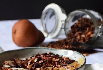 Je n’en suis pas à ma première recette de granola maison, en revanche c’est bien mon premier essai de granola au chocolat, naturel et pauvre en sucre – ne partez pas tout de suite en courant, ce n’est pas une recette de régime -. Même si Berlin n’a pas encore réussi à me transformer en hippie, j’essaye malgré tout de faire plus d’efforts pour manger bio, éviter les produits transformés, et utiliser davantage de produits naturels allant du cacao cru jusqu’à parfois même les cosmétiques – j’imagine que le fait d’avoir maintenant un salaire aide aussi côté habitudes de consommation -. Le granola du commerce étant souvent assez riche, cher et loin d’être aussi savoureux qu’un granola maison, je préfère bien souvent la seconde option.