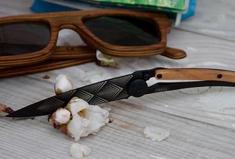 J'ai choisi le Deejo de 9cm en titane noir avec gravure Art Déco et manche en bois de genévrier au prix de 44,90€.