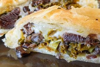 - Placez une cuillère à soupe voire deux, de kale et gésiers au milieu de 4 morceaux de pâte feuilletée et une tranche de mozzarella sur chacun d'eux.