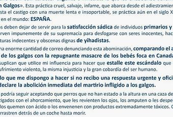 Il est nécessaire d'abolir urgemment et immédiatement ce que les galgueros appellent " la chasse aux Galgos ". Cette pratique cruelle, sauvage, infâme qui commence par un entraînement inhumain et qui se termine par des châtiments entraînant une mort lente et insupportable, et qui se déroule encore au XXIe siècle dans un seul pays au monde : l'Espagne.