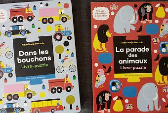 La parade des animaux est un livre-puzzle contenant 6 grandes pièces cartonnées imprimées recto-verso à détacher et à assembler entre elles pour former deux puzzles. L'idée est d'expliquer aux petits la notion de l'ordre croissant et décroissant soit du "plus grand au plus petit" et inversement. Je trouve l'idée très sympa et visuellement réussi grâce au graphisme multicolore, pimpant et accrocheur d'Aino-Maija Metsola. L'idée du puzzle est également pratique et bien pensée dans la mesure où l'enfant va devoir lui-même apprendre à recomposer le bon ordre en observant les animaux. La galerie d'animaux est large même si elle est classique : le papillon, le poisson, le perroquet, le singe, le lion et l'éléphant, mais comme ce livre interactif et ludique est destiné aux plus jeunes, cela ne dérange pas. Toutes les pages de l'album sont entièrement illustrées : c'est joyeux, très coloré avec des imprimés aux motifs simples et efficaces. D'ailleurs bien que finlandaise, on retrouve un côté "africain" au style de l'illustratrice qui aime ici la nature avec des décors floraux et végétaux.