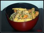 Commencez par hacher le gingembre et l'ail. Réservez. Faites revenir dans un wok le tofu, les graines de sésame grillées, les petits pois et les champignon dans un peu d'huile de sésame. Ajoutez les pâtes. Faites cuire environ 2 minutes tout en remuant. Ajoutez le lait de coco avec le gingembre et l'ail haché. Laissez épaissir 1 minute. Sortez le wok du feu parsemez de coriandre et du jus de citron vert. C'est prêt!