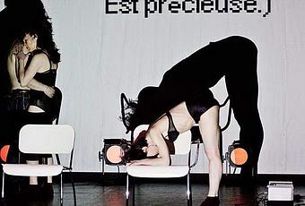 Être une voix, un corps, une main, un pas, un rire, un poème... Être un petit chien blanc qui court sans se lasser après la même branche, Ou un vieux prêtre noir qui dit sans pleurnicher la messe du dimanche : Bref avoir une fois, minuscule ou sublime, un ensemble de gestes Comme une danse idiote, nous dirons le pas turc, une danse modeste Qu'on danse sans effort, minime apprentissage, très peu de réflexion : Atteindre le bonheur immobile et cyclique de la répétition. Des textes de Houellebecq, une chorégraphie de Rita Cioffi, le tout baignant dans un environnement sonore, visuel et lumineux s'essayant à être différent, gageure à laquelle nous nous trouvons confrontés dès le début de la soirée.