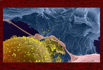 Lymphocytes infectés par le VIH-1. Les particules virales (en jaune) bourgeonnent à la surface d'une cellule infectée. Image réalisée en microscopie électronique à balayage. Olivier Shwartz / Ultrapole Institut Pasteur