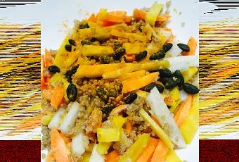 Une recette tonique, saine et simple à réaliser avec du quinoa et des crudités coupées comme des petites frites qui craquent sous la dent.C’est bon pour le moral et c’est bon pour le corps alors faut vraiment pas se priver avec les betteraves de couleur, les radis et les carottes. A vous de faire marcher votre imagination avec ce que vous avez dans votre frigo.