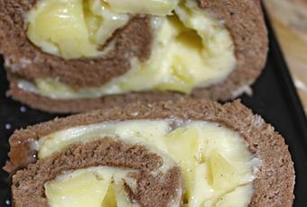 Ajoutez les pommes caramélisées puis roulez de nouveau le biscuit, filmez le en le serrant légèrement et réservez le au frigo environ 1 à 2h.