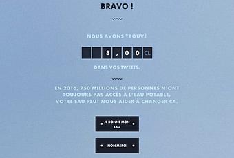 L’opération « H2O Filter » ne se contente pas d’utiliser Twitter comme relais de communication mais elle en fait le coeur de son dispositif. Il s’agit d’une expérience unique et ludique. Les internautes peuvent filtrer leur compte Twitter pour en extraire les H, 2 et O et créer des molécules d’eau virtuelles. Une fois transformée en don, cette eau deviendra très concrète et permettra de financer des programmes qui améliorent l’accès à l’eau Potable. Et, pour compléter le dispositif, l’opération descend dans la rue grâce à JCDecaux qui met à disposition ses 52 mobiliers digitaux du parvis de la Défense les journées du Lundi 21 et Mardi 22 Mars. h2o-filter.unicef.fr