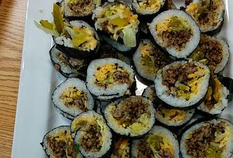 -Étendre le riz sur le côté mat de la feuille nori et prenant soin de laisser un espace de 1 pouce sans riz dans le haut de la feuille. Pour faciliter le tout bien mouiller les mains au préalable, et rincer ses doigts au besoin.-Étendre une généreuse cuillère à soupe de sauce sur le riz. Garnir la partie inférieure de bœuf, fromage, oignon, cornichon, laitue et graines de sésame en les superposant.- Avec le côté de la main, humidifier la partie de la feuille d’algue sans riz. À l’aide d’un tapis à sushi, Enfermer la garniture dans la feuille de nori en roulant le bord le plus proche de vous vers le haut, et en pressant pour que les ingrédients soient bien tassés. On fait ainsi un demi-tour en appuyant délicatement pour emprisonner la garniture. Ne pas peser trop fort car votre rouleau sera carré. On poursuit le mouvement de rouleau en tirant le tapis vers le haut dans un mouvement continu en s’assurant de bien celer le rebord préalablement mouiller. On dépose le rouleau sur la jonction et on le laisse reposer avant de le couper.-Pour couper, Assurez-vous d’avoir un couteau bien aiguisé. Mouiller la lame à chaque découpe afin d’éviter que le riz ne colle. Faire une première découpe au centre, puis les 2 extrémités. Coupé le 2 parties en 4 morceaux de même grosseur. l ne reste qu’à déposer dans un plat de service et déguster avec le restant de sauce !