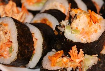 Sushis :2 feuilles de nori2 grosses balles de baseball de riz1 grosse carotte râpée1 branche de céleri coupée en fines juliennes1 petit sac de doritos de 80g émietté1 poitrine de poulet cuite, effilochée et généreusement arrosée de sauce red hot ( la quantité est au goût selon votre tolérance au piquant)