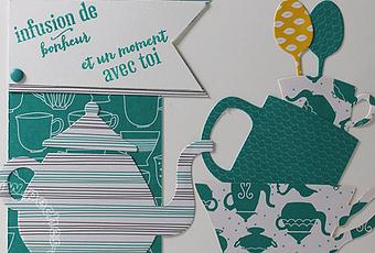 Pour ces 2 réalisations j’ai utilisé les poinçons framelits « l’heure du thé » et le set de tampons « petite tasse » et le bloc de papier assortis