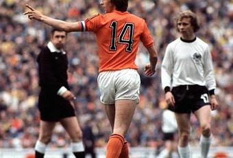 Cruyff honore sa première sélection en octobre 1966 à seulement 19 ans. Deux mois plus tard, il est le premier international néerlandais à recevoir un carton rouge et à être expulsé, lors d’un match contre la Tchécoslovaquie. Il sera suspendu un an par sa fédération. Cet épisode va le pousser à moins s’investir dans la sélection pendant quelques années. La Coupe du monde 1974 représentera l’apogée de la carrière de Johan sous le maillot orange. Associé à des joueurs talentueux comme Robert Rensenbrinck, Johnny Repp, Ruud Krol et Johan Neeskens, Cruyff s’épanouit pleinement avec les « Oranges mécaniques » et se permet de terrasser l’Argentine 4-0 (2 buts de Cruyff) puis le Brésil 2-0 (1 but de Cruyff). Malheureusement, cette équipe incroyable s’inclinera en finale face à la RFA de Franz Beckenbauer 2 buts à 1. Alors que les Néerlandais semblaient avoir le match en main et menaient 1-0, ils ont déjoué et ont cédé face au réalisme allemand.