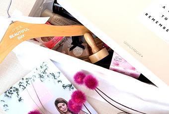 A la réception du coffret, je découvre une grande box cartonnée toute de rose et blanc vêtue. En même temps ça se comprend, ce sont les teintes qui représentent bien l'univers Mariage... A l'intérieur, je découvre donc la sélection des 11 produits et accessoires qui n'est pas une surprise car elle était dévoilée sur le site au moment de la commande. A coté il y a également un petit livret avec le descriptif du contenu, des conseils pour passer un bon mariage et un DIY pour un porte-alliances en argile personnalisé.