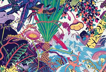 Le plus moderne est Micah Lidberg, illustrateur américain, qui nous propose un voyage psychédélique dans une jungle peuplée d’animaux de cartoons. Pas de texte ici, seulement une double page totalement allumée, avec un singe blanc surfant sur une girafe, de fleurs dans la gueule carnassière d’un crocodile.