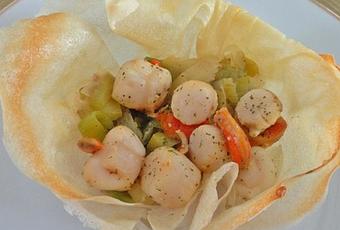 Déposer un croustillant de feuille de brick dans l'assiette de service, garnir de 2 grosses cuillères à soupe de fondue de poireaux et de 3 grosses noix de St Jacques ... pour moi, ce sera 7 petites noix de St Jacques. Verser le reste de jus de la poêle sur les St Jacques.