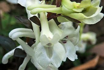 Corydalis cava (Corydale creuse) : herbacée vivace à souche renflée ; tige simple peu feuillée, creuse ; feuilles 2 fois triséquées ; fleurs rose-pourpre ou blanches en grappe terminale dressée ; éperon long, nettement arrondi au sommet ; bractées ovales entières.