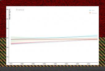 · l’IMC moyen global des hommes et des femmes augmente de l’équivalent d’un gain de poids de 1,5 kg par personne et par décennie. La France devrait suivre la tendance, pour les hommes seulement (Voir courbe ci-contre),