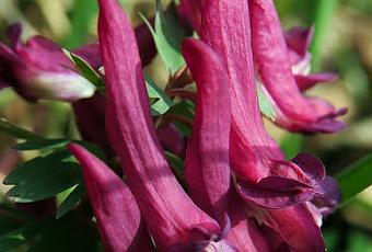 Corydalis solida (Corydale pleine) : herbacée vivace à souche renflée ; tige simple peu feuillée, pleine ; feuilles 2 fois triséquées ; fleurs rose-pourpre en grappe terminale dressée ; éperon long, presque droit ; bractées larges et digitées.