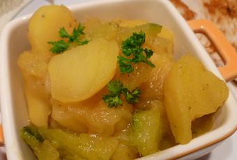 Une fois l’oignon doré rajouter les pommes de terre et les courgettes, le cœur de bouillon et l’eau.