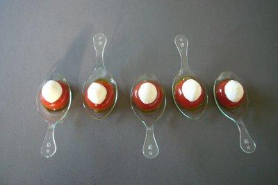 La tomate /mozza est un duo bien connu qui revient souvent sur les tables au moment de l'été, j'aime beaucoup la mozza et j'avais envie de la relooker version été 2008. J'ai utilisé mon allié préféré de l'été ( pour ses atouts pour la minceur, peut-être ???) l'agar-agar.Pour 20 cuillères apéritives :