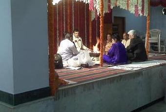 Mis à part de nombreuses grappes de fleurs, le temple n’offre que peu d’ornementation. La grande pièce, illuminée par des néons, ressemble à une salle des fêtes des plus communes. Les mariés et leurs parents se placent sur une sorte de scène sous un dai de fleurs blanches et orange qui forme l’enceinte sacrée au sein de laquelle le mariage sera célébré.