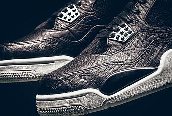 A-t-on vraiment encore besoin de vous la présenter ? Bon, pour ceux qui viennent de débarquer dans cet univers, cette Jordan 4 a tout d’une grande. Un habillage des plus premium qui soit, du cuir imitant l’alligator ou autre reptile rampant. Les traditionnels “grillages” en plastique sur la quatrième silhouette du Jumpman sont remplacés par du pony hair, ainsi qu’une partie de la languette. L’ensemble est d’un noir profond déposé sur une semelle “Sail” ou blanc cassé pour assurer un contraste parfait.
