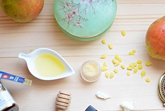 1. Se laver les mains et s'assurer de l'hygiène des produits utilisés 2. Faire fondre au bain marie les corps gras(huile+beurre végétal) avec la cire3. lorsque tout a fondu ajoutez la vitamine E l'extrait de poire et le miel4. Remuer jusqu'a ce que le mélange refroidisse5. Mettre le mélange dans le pot