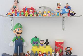 Quant aux jouets, je m'amuse beaucoup à les mettre en valeur sur les différentes étagères de la chambre. Avec la saison des vides greniers qui reprend, il arrive des petits nouveaux souvent et il faut bien leur trouver une petite place.