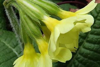 Primula eliator (Primevère élevée) : herbacée vivace à rosette de feuilles basilaires spatulées gaufrées ; fleurs réunies en ombelle portée par une longue hampe et souvent toutes penchées du même côté ; calice appliqué à nervures plus foncées que le reste du tube ; corolle plane jaune clair à 5 lobes portant un anneau orange clair à la gorge, fleur inodore.