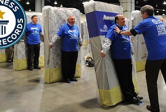 La chaîne des magasins Aaron’s vient de battre le record du monde du plus grand domino humain sur matelas. Officialisé par le très sérieux Guinness World Records, il a fallu rassembler 1200 employés de l’enseigne pour constituer cette chaine humaine et décrocher le précieux trophée.