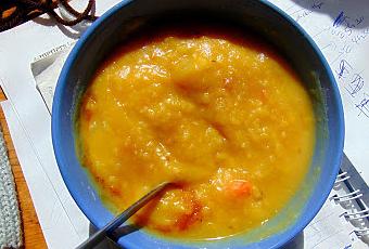 Tout simplement des carottes, du céleri et de l'oignon émincés revenus dans un soupçon d'huile (et encore; souvent je les dépose directement à bouillir avec les pois, sans passer par l'étape "poêle" tout simplement), puis des pois cassés... puis de l'eau... du bouillon d'épices ... beaucoup, beaucoup de sariette... et du temps devant soi!