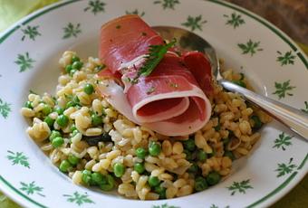 Pour changer du riz, cette version printanière du risotto est préparée avec du blé précuit et des petits pois. On peut l'accompagner de jambon cru ou de poisson.